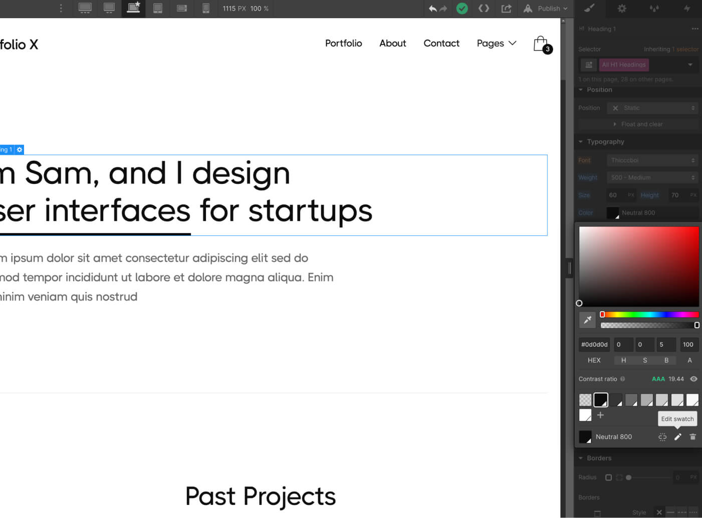 Portfolio X template is built using Color Swatches, meaning that you can easily edit a color swatch to be updated site-wide.